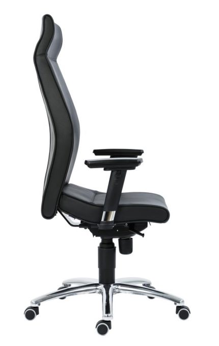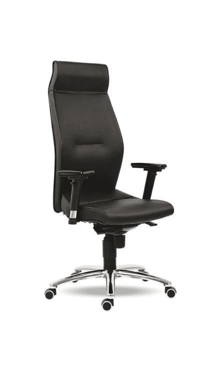 Fauteuil de bureau en simili-cuir noir mat, aux lignes puissantes et à la texture lisse et résistante. Dossier haut structuré avec nervures horizontales pour un soutien ergonomique affirmé, assise profonde et accoudoirs chromés fins et courbés. Base étoilée en métal brossé et roulettes noires assurent stabilité et mobilité fluide. Un design sobre et autoritaire, idéal pour les bureaux exécutifs ou les espaces modernes qui exigent une présence discrète mais affirmée — où le confort se marie à l’élégance fonctionnelle.
