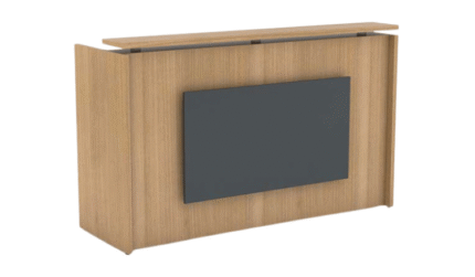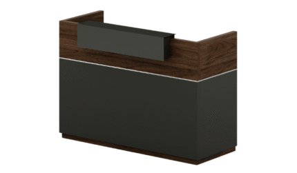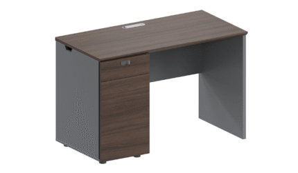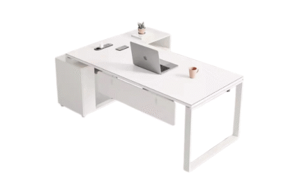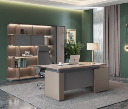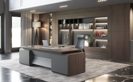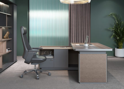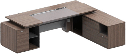 Bureau direction a retour avec niche à étagère, une porte battante et 3 tiroirs, en bois MFC, épaisseur plateau : 25mm avec passe câble rectangulaire, piètement métallique en tube carrée et forme carrée dune seul cote et un voile de fond